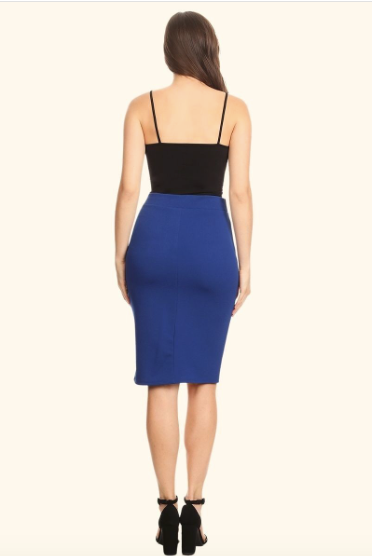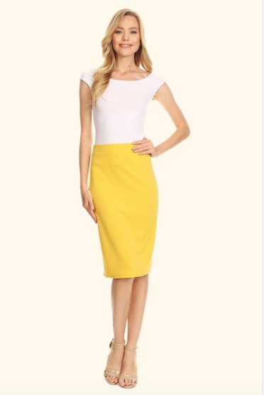 Solid, high waist, knee-length pencil skirt in a fitted style with a waistband.