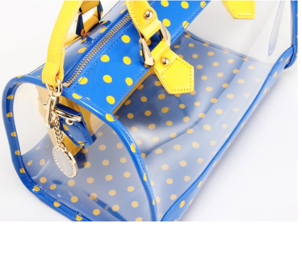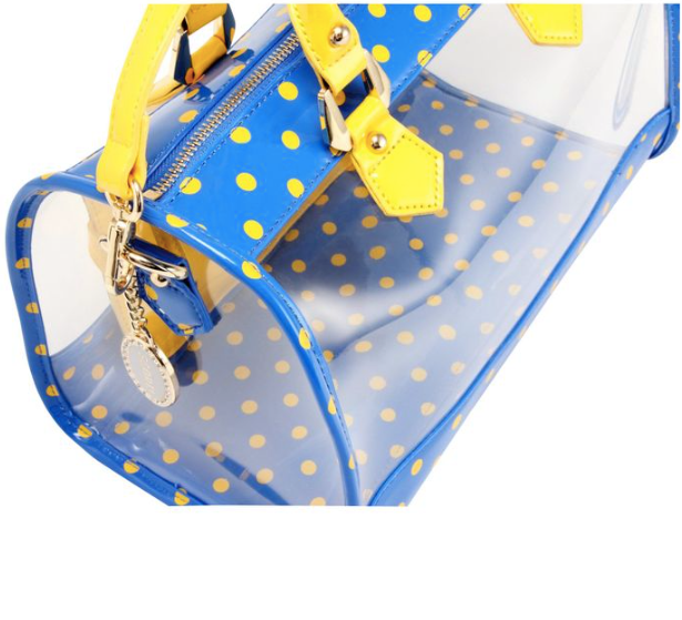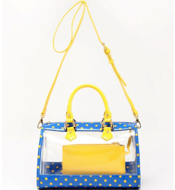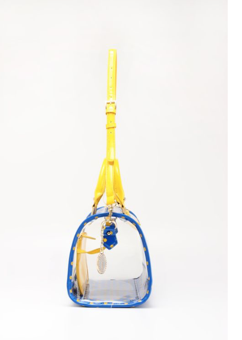 mperial Blue/Gold Hardware: Metallic Gold Key Features: Measures: 12” W x 8” H x 6” D- fitting within the stadium standard 12x12x6 CLEAR AND MEETS STADIUM SECURITY REQUIREMENTS for NFL, NCAA, PGA, & high school stadiums Crafted from the thickest, clear polyurethane (100%PU) Small feet studs to protect exterior bottom Durable, adjustable and removable 45-50”shoulder strap AND comfortable carrying handles Durable zippered top closure to keep contents safe Large attached interior zippered matching privacy pouch for cash and I.D-measures 10”L x 7” H Side D-rings for keys, sorority dangles or pom poms Roomy interior Machine Stitched-NOT GLUED Weatherproof, water and spill resistant-cleans up easily Perfect for work environments requiring clear bags