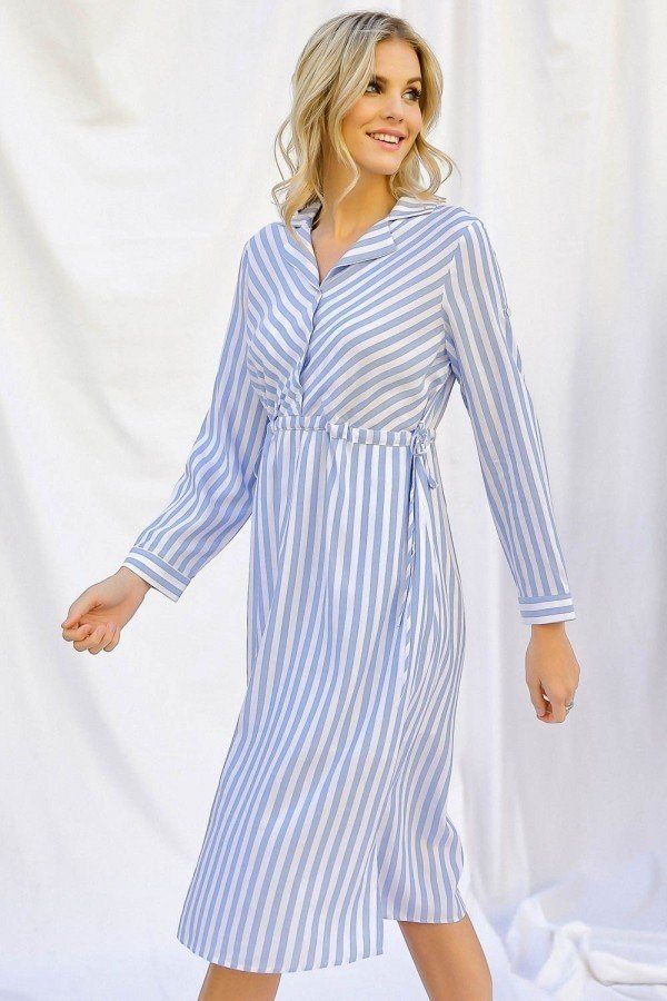 Stripe Print Cinched Waist Long Sleeve Shirt Midi Dress