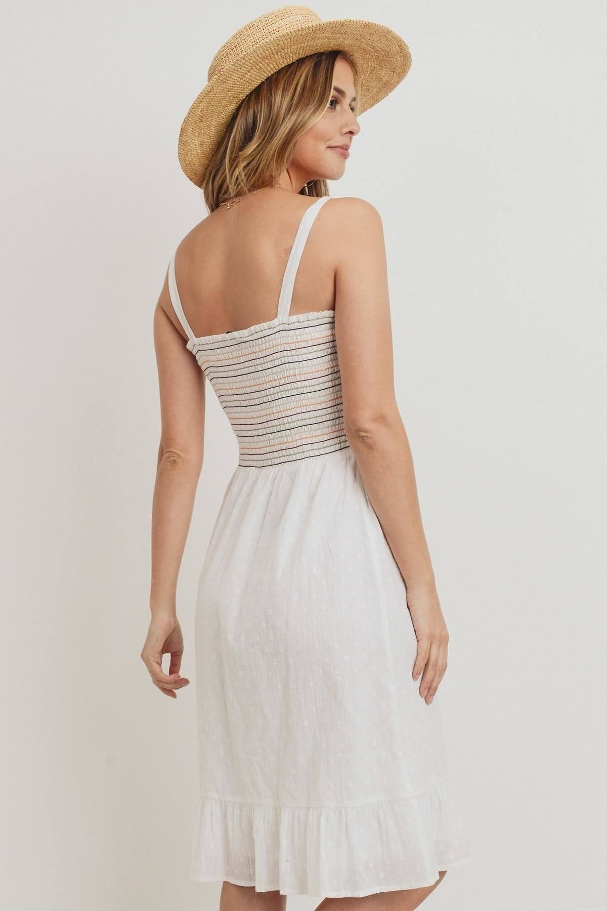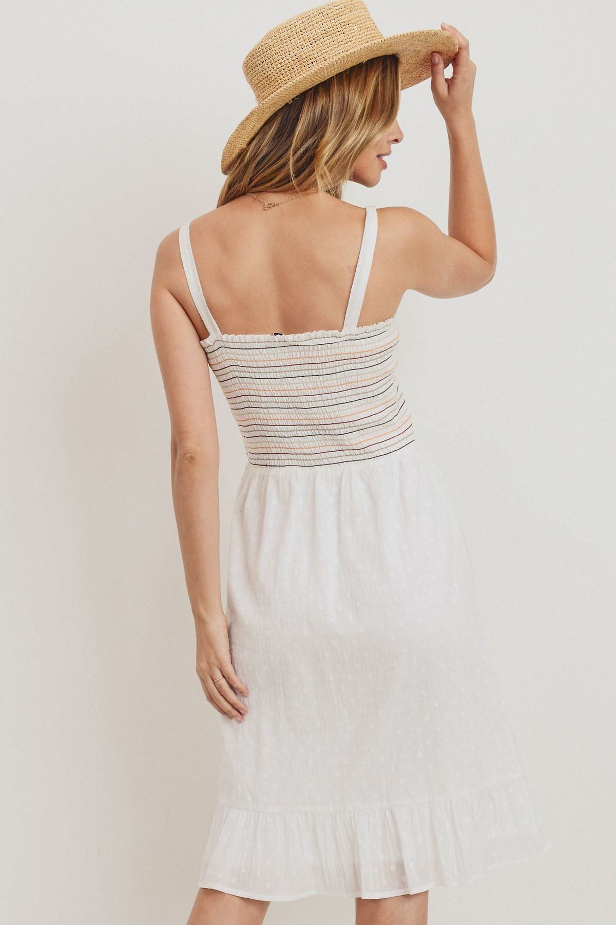 Spaghetti straps Multi color striped smocking Ruffled hem Woven fabric