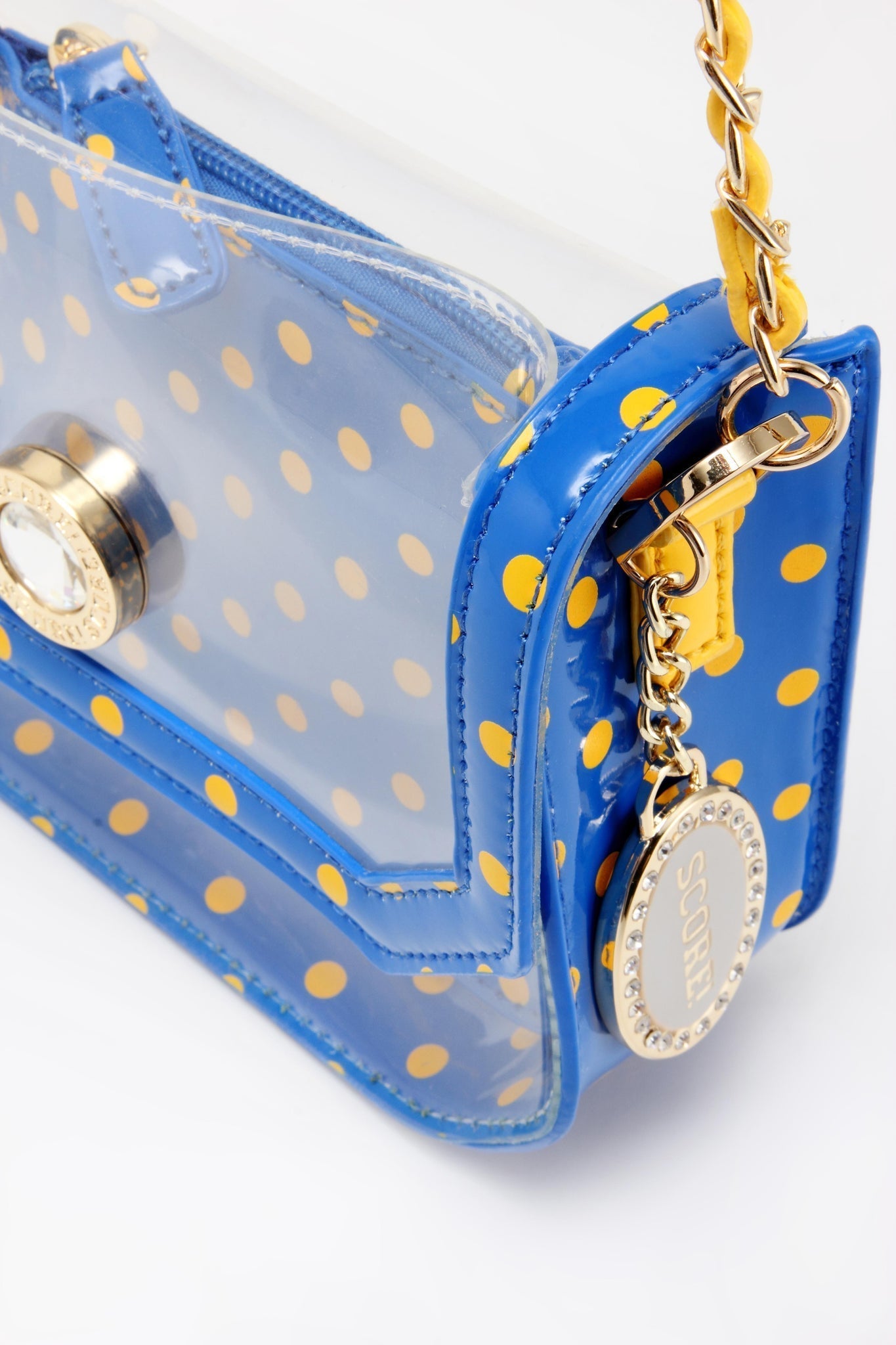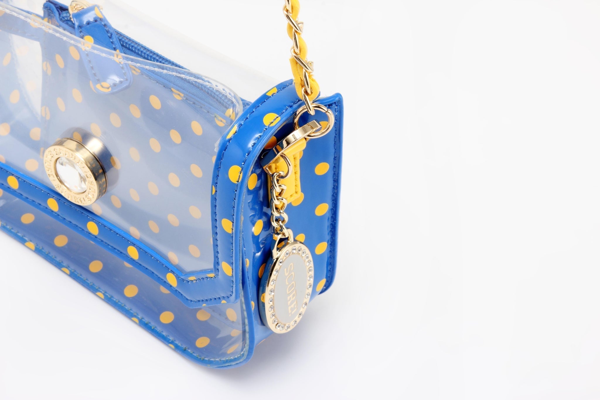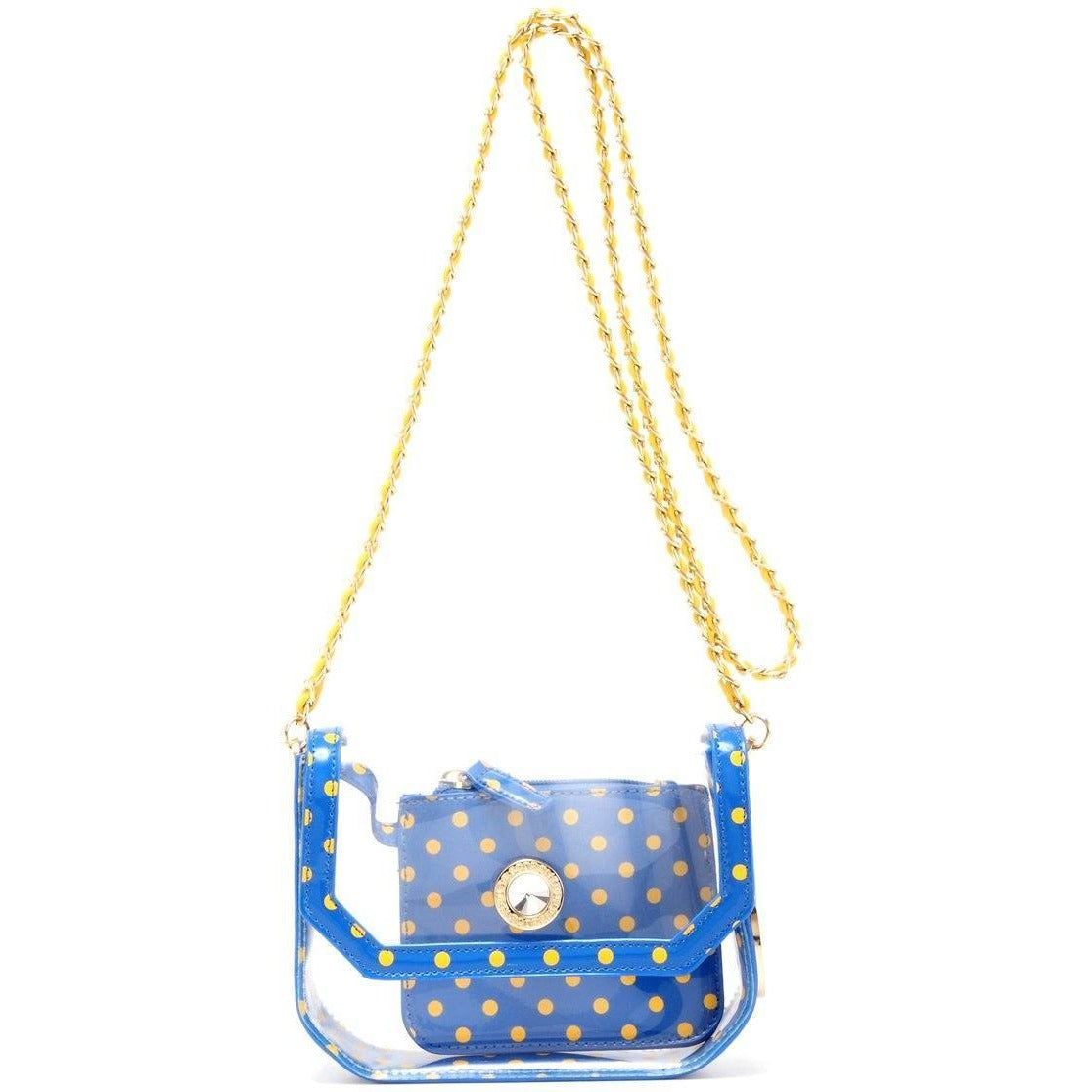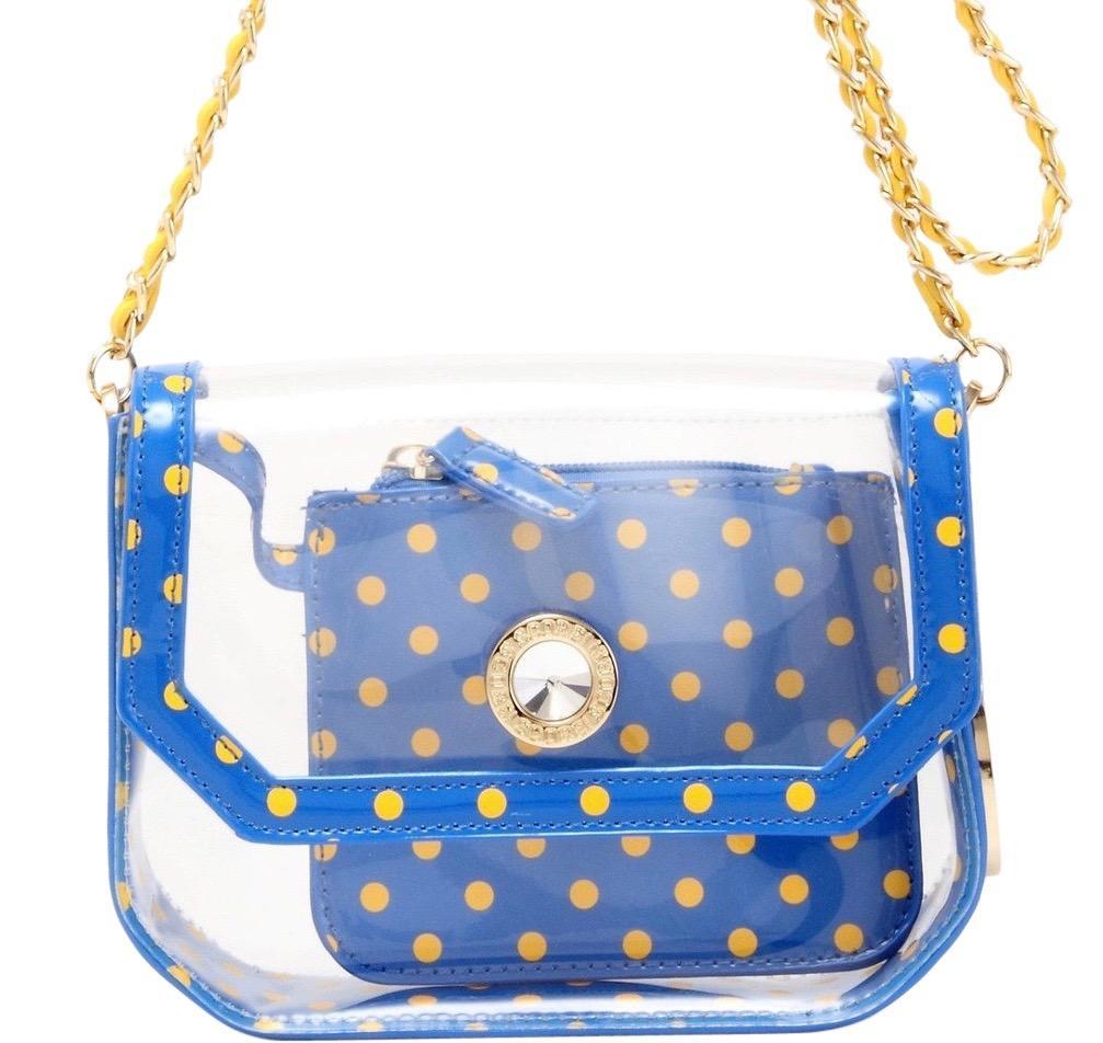 SCORE! Chrissy Small Designer Clear Crossbody Bag - Royal Blue and Yellow Gold