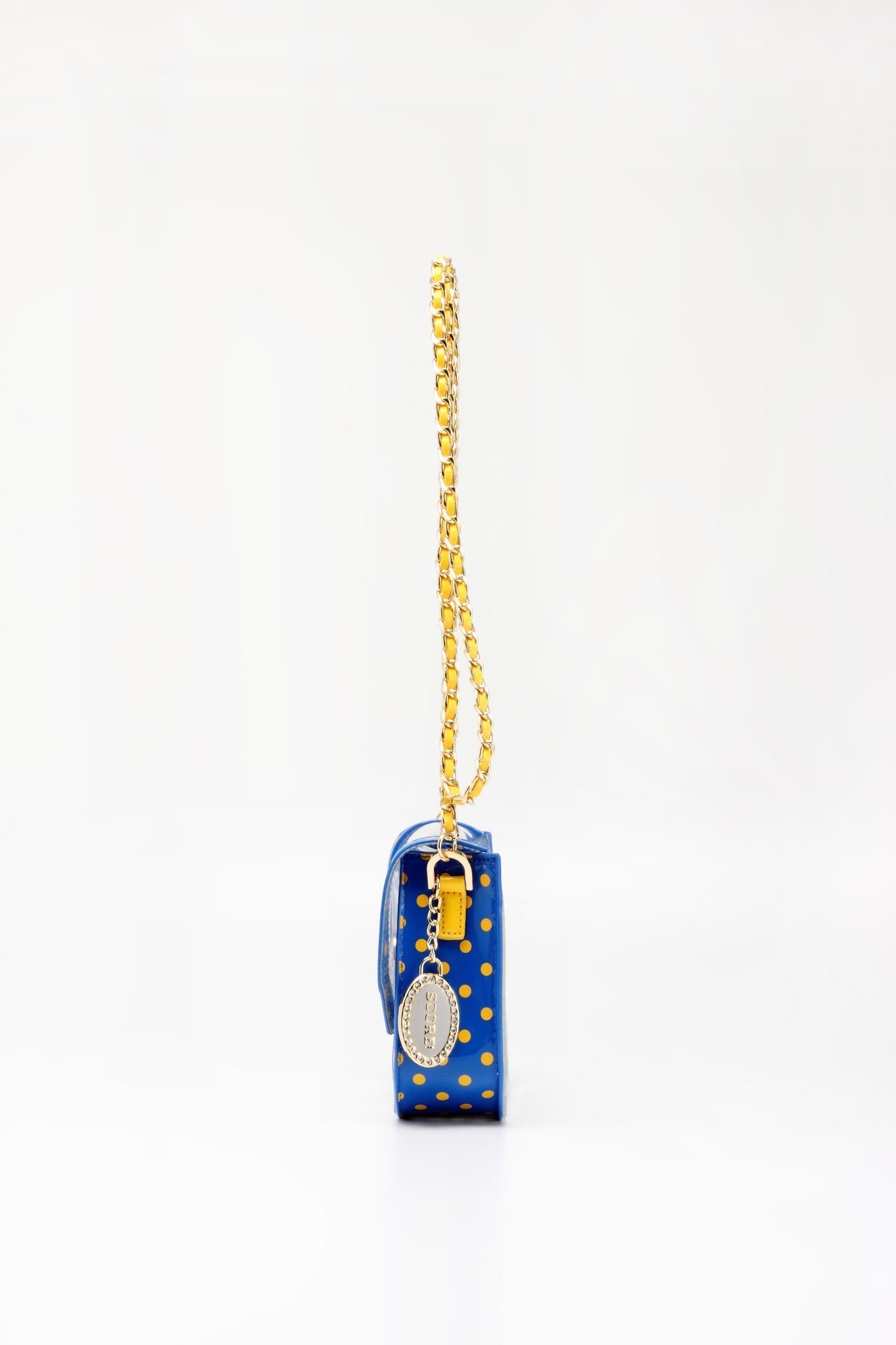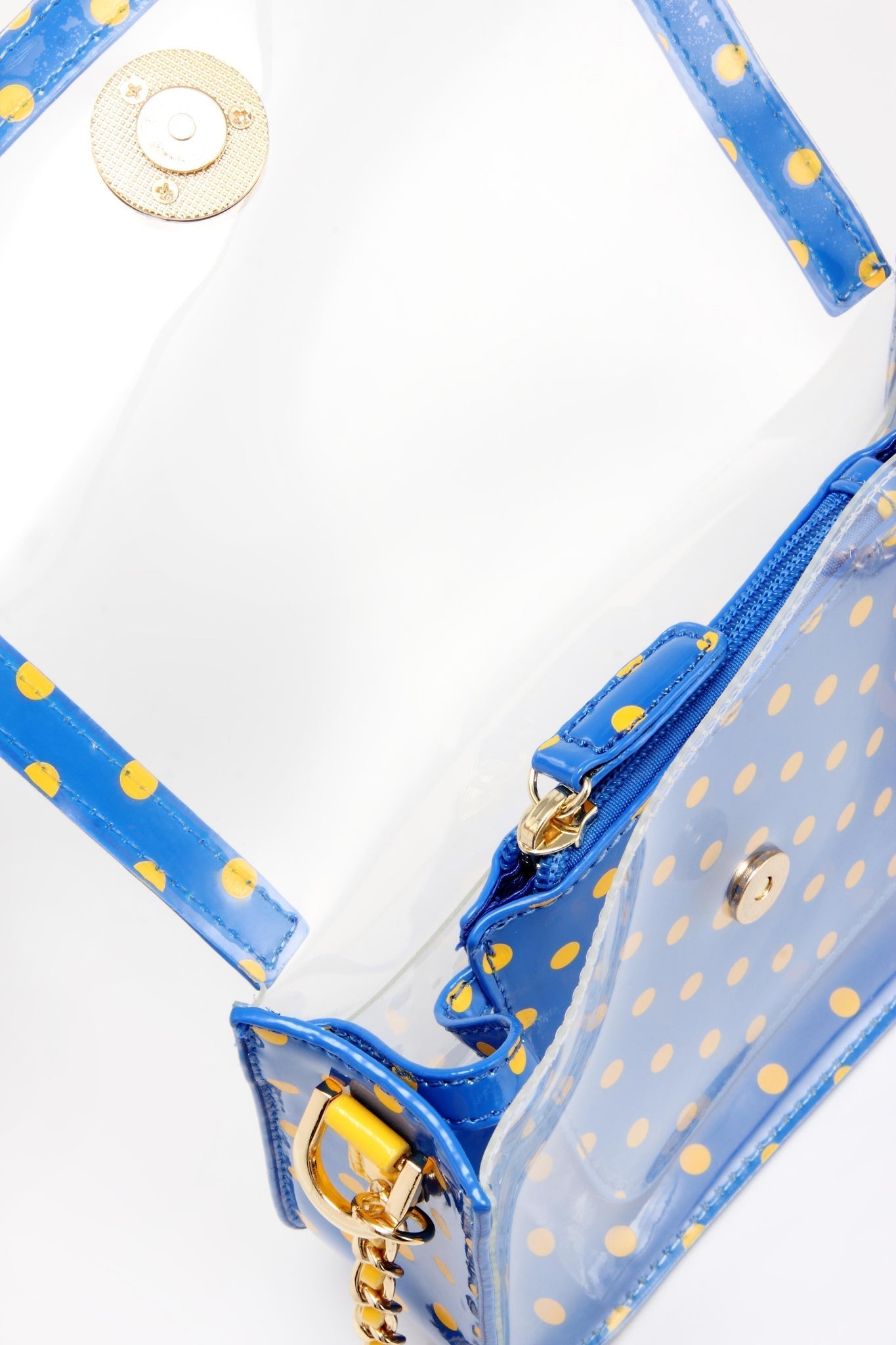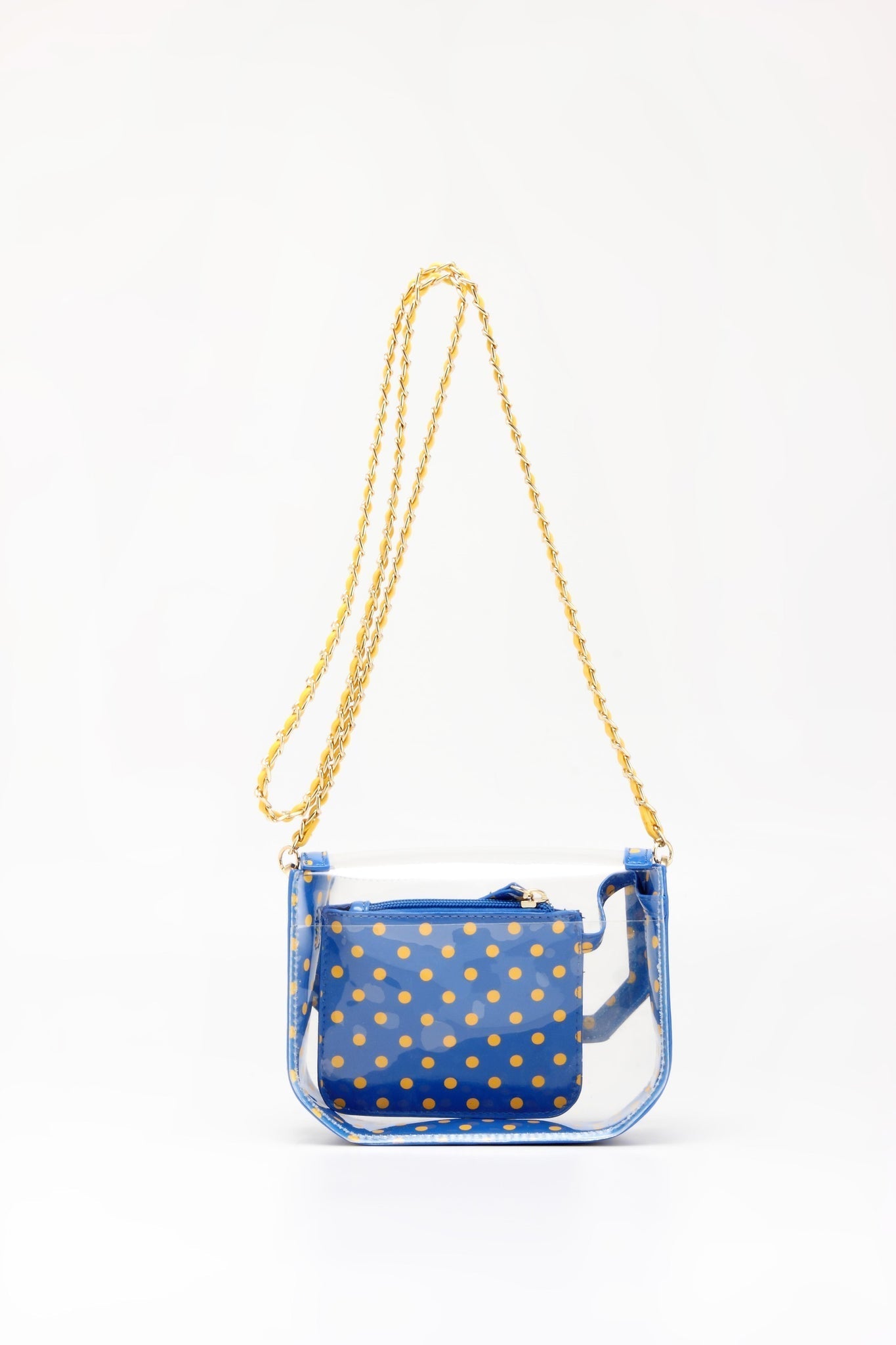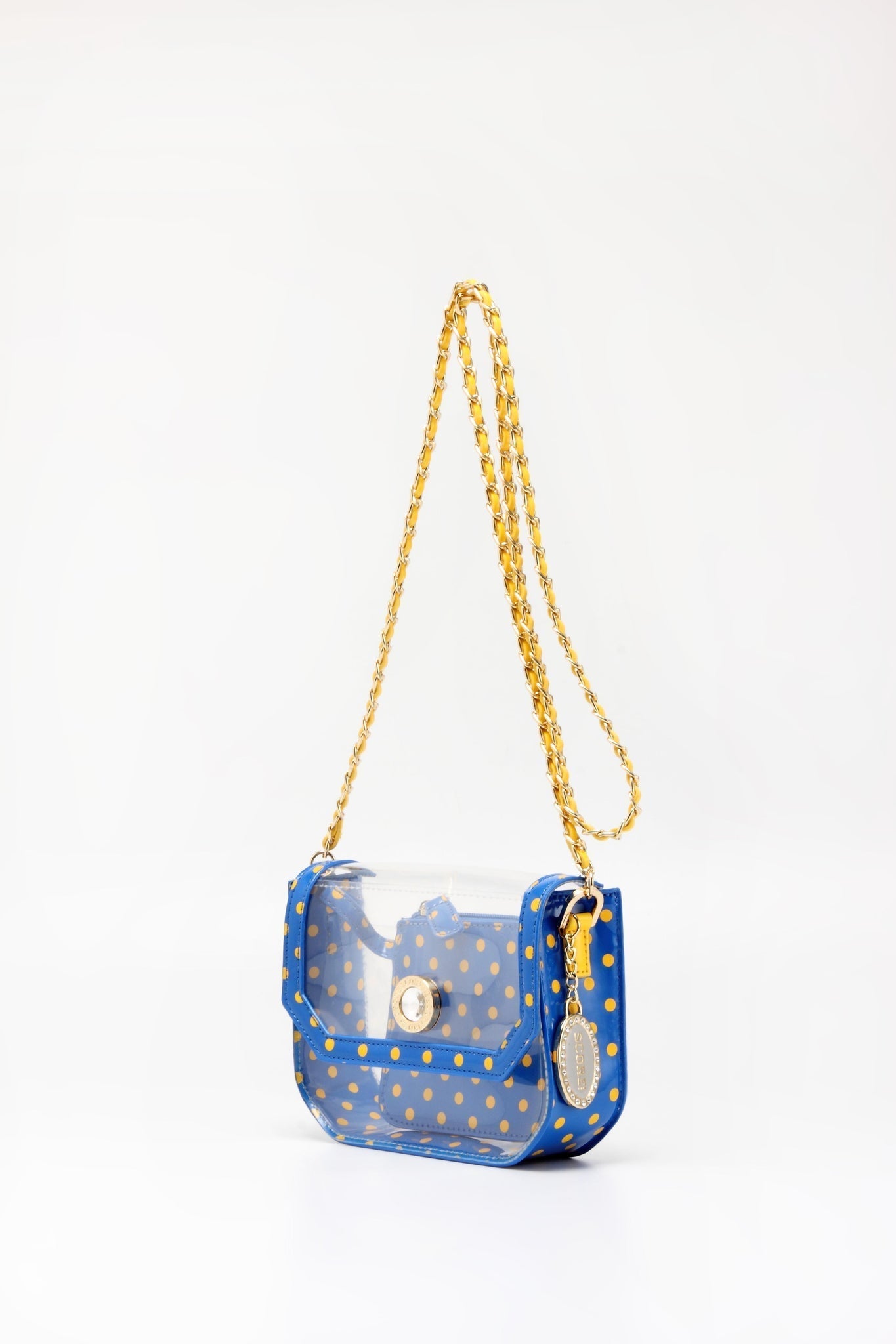 SCORE! Chrissy Small Designer Clear Crossbody Bag - Royal Blue and Yellow Gold