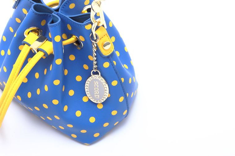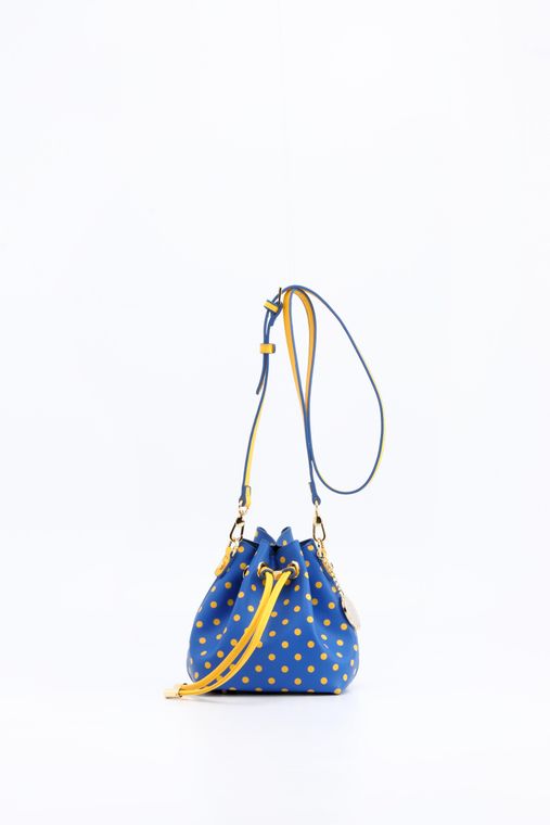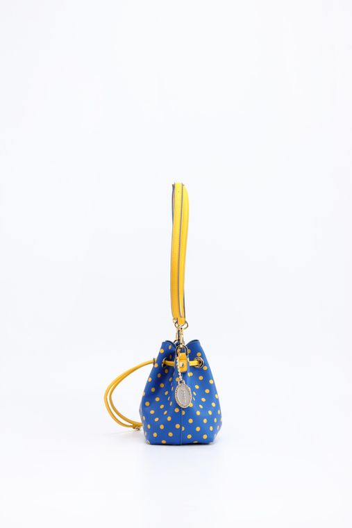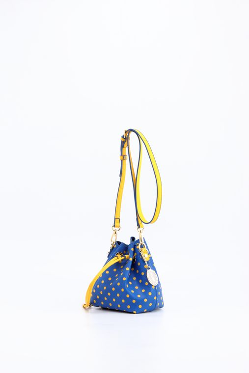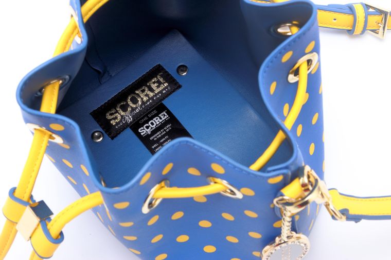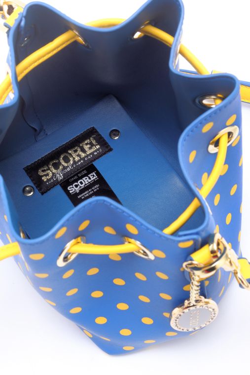 SCORE! Sarah Jean Small Crossbody Polka dot BoHo Bucket Bag- Royal Blue and Gold Yellow